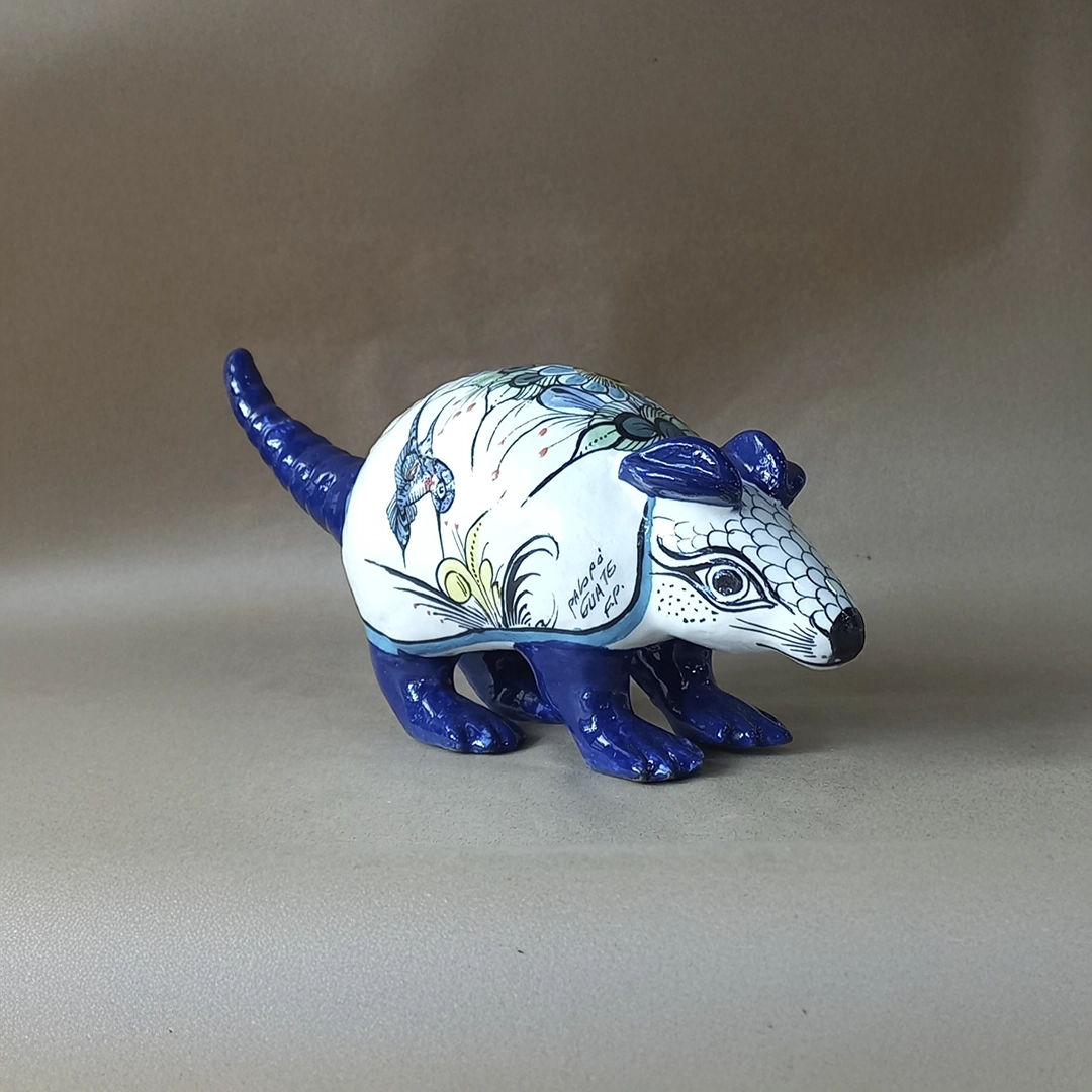 This vibrant ceramic armadillo figurine is a unique piece of folk art, meticulously hand-painted and glazed by artisans from San Antonio Palopó, Guatemala, a town famous for its pottery tradition. The sculpture features a striking design dominated by a glossy deep cobalt blue on the legs, tail, and head, contrasting with a white carapace. The shell is adorned with intricate hand-painted motifs, including stylized scales, colorful foliage, and a small tropical bird design, all executed in the distinctive artistic style of the Lake Atitlán region, making this a beautiful and culturally significant decorative item.