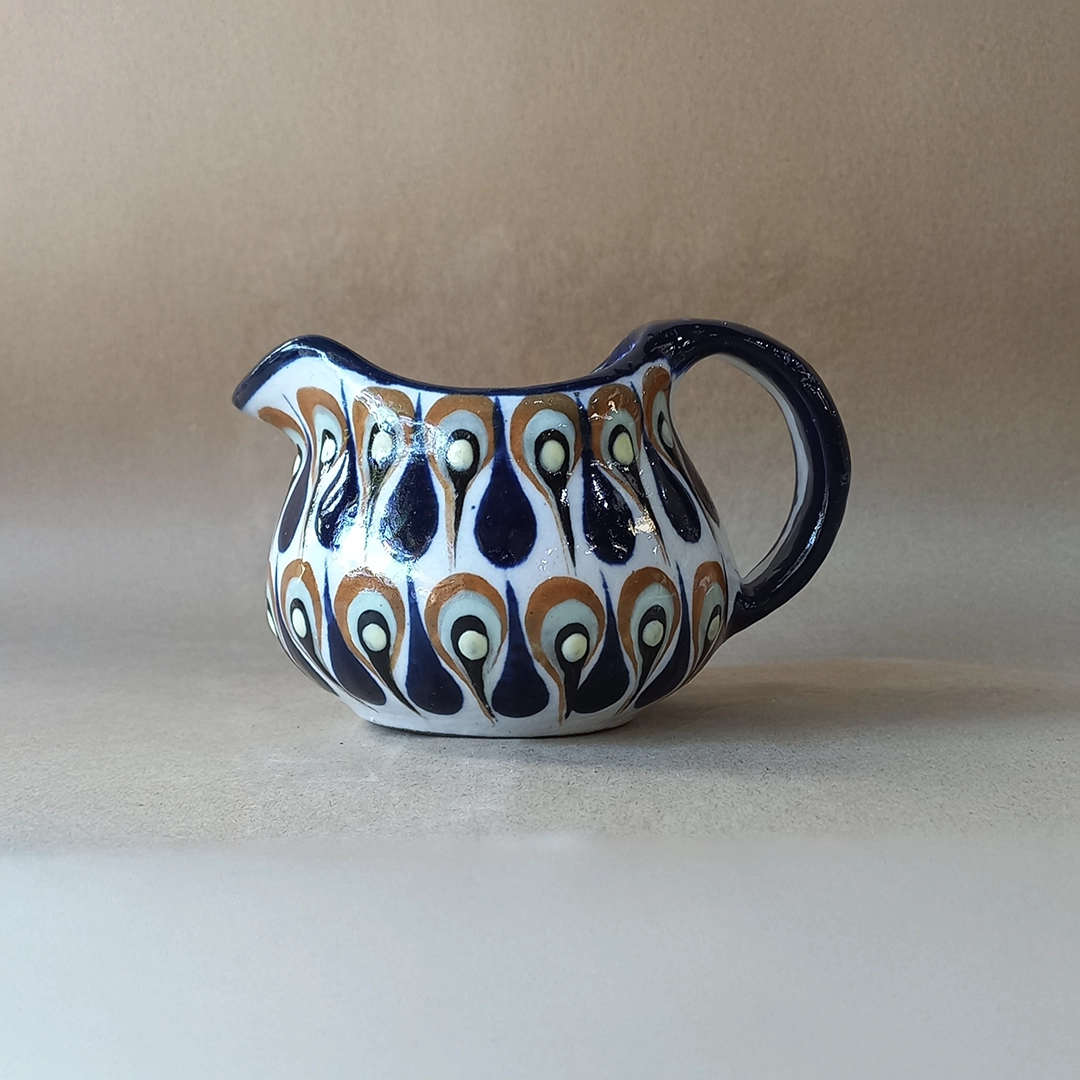 This vibrant ceramic creamer is a unique piece of functional folk art, meticulously hand-painted and glazed by artisans from San Antonio Palopó, Guatemala, a town renowned for its high-quality pottery. The small, rounded pitcher features a glossy white base contrasted with a deep cobalt blue handle and spout. The body is adorned with a detailed, repeating pattern of vertical teardrop or petal motifs, rendered in a striking palette of navy blue, burnt orange, and light teal. This beautiful, handcrafted piece is perfectly sized for serving cream or syrup and showcases the distinctive artistic traditions of the Lake Atitlán region.