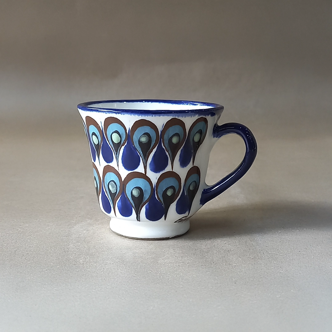 This appealing ceramic cup is a charming example of functional folk art, meticulously hand-painted and glazed by artisans from San Antonio Palopó, Guatemala. The sturdy, rounded mug feature a classic shape, a comfortable cobalt blue handle, and a thick blue rim. The cup (the “hummingbird” or pajaro pattern) is decorated with a detailed scene of a hummingbird feeding among stylized flowers and foliage, while the other cup (the liso or “plain” pattern) is covered in the region’s characteristic high-contrast, rhythmic pattern of blue, aqua, and terracotta teardrop motifs. These cups beautifully showcase the playful yet detailed artistry of the Lake Atitlán region.