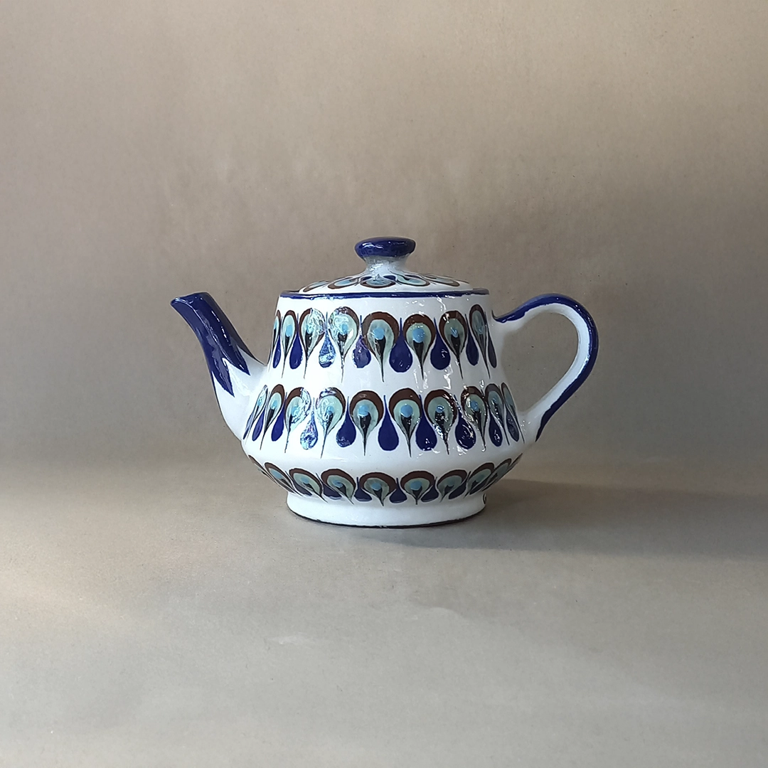 This striking ceramic Low-Base Teapot (Tetera bajo base liso) is a unique piece of functional folk art, meticulously hand-painted and glazed by skilled artisans from San Antonio Palopó, Guatemala. The teapot features a wide, stable base and a classic tapered silhouette with a sturdy handle and matching lid. It is entirely adorned with the community’s signature “plain” (liso) design, characterized by rhythmic, high-contrast teardrop motifs in deep cobalt blue, aqua, and terracotta orange against a glossy white background. This durable piece beautifully blends daily utility with the intricate craftsmanship and vibrant aesthetic characteristic of the Lake Atitlán region.