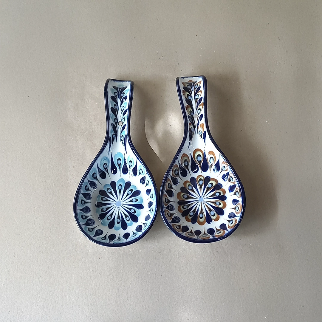 This ceramic Long Spoon Rest is unique pieces of functional folk art, meticulously hand-painted and glazed by artisans from San Antonio Palopó, Guatemala. Both elongated, ladle-shaped dishes feature a glossy white base and a bold cobalt blue rim, with the interior of the rest serving as a canvas for the region’s characteristic high-contrast, rhythmic designs: one features the dense, stylized teardrop or “peacock feather” pattern in a palette of blue and light aqua, while the other utilizes a warmer palette incorporating brown and terracotta orange accents, making them both beautiful and practical additions to any kitchen.