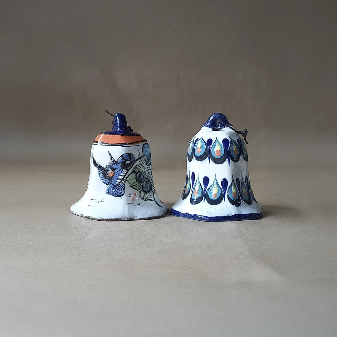 This charming ceramic Small Bell is a unique piece of miniature folk art, meticulously hand-painted and glazed by artisans from San Antonio Palopó, Guatemala, and is sold individually. The bell has a distinct flared shape and features two available hand-painted designs: one (the “bird” pattern) is adorned with a detailed hummingbird and floral scene against a white base with a terracotta accent band, while the other (the liso or “plain” pattern) is covered in the region’s characteristic high-contrast, rhythmic pattern of blue, aqua, and terracotta teardrop motifs. Each bell is finished with a cobalt blue rim and loop, beautifully showcasing the playful yet detailed artistry of the Lake Atitlán region.