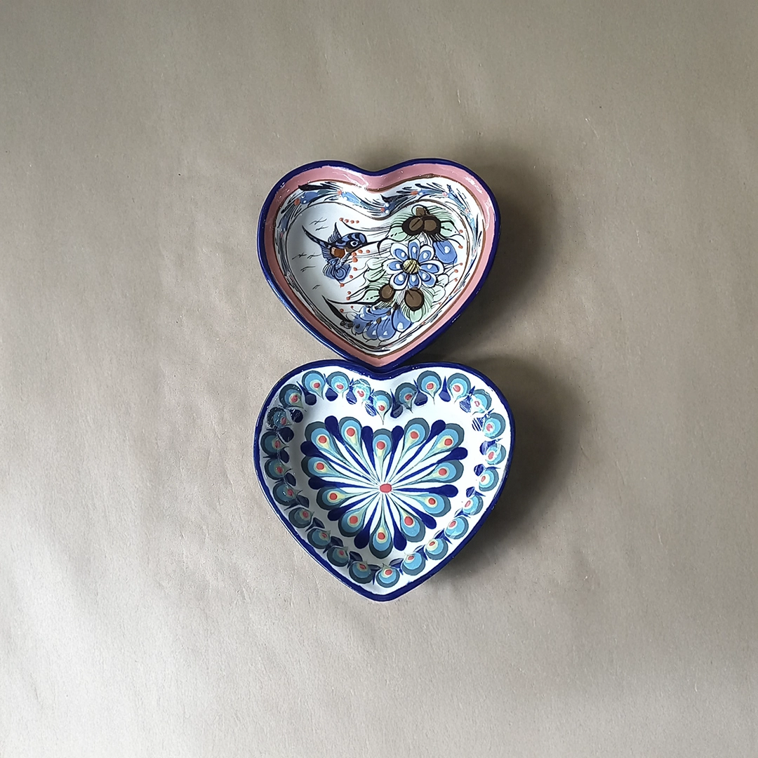 This attractive ceramic Small Heart Dish is a unique piece of functional folk art, meticulously hand-painted and glazed by artisans from San Antonio Palopó, Guatemala, and is sold individually. The small, heart-shaped plate features a slightly raised rim and showcases two distinct hand-painted designs: the dish on the bottom features a central starburst pattern composed of the region’s characteristic high-contrast, rhythmic teardrop motifs in blue, aqua, and terracotta, while the dish on the top features a central hummingbird surrounded by large, stylized blue and pink flowers and foliage. Both pieces are finished with a bold cobalt blue rim, beautifully integrating the detailed artistry of the Lake Atitlán region into decorative serving ware.