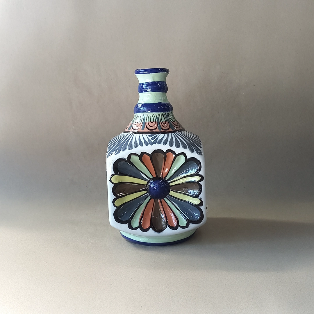 This striking ceramic Baroque Vase (Florero Barroco) is an exquisite piece of functional folk art, meticulously hand-painted and glazed by skilled artisans from San Antonio Palopó, Guatemala. The vase features a unique, square-bodied silhouette that tapers into a slender, ringed neck, and it offers a choice between two signature artisanal styles: the “bird” design showcases a vibrant hummingbird amidst lush, stylized flowers and foliage, while the “plain” (liso) version is adorned with a large, bold floral medallion featuring multi-colored petals in shades of terracotta, forest green, and deep blue. Finished with a glossy glaze and rhythmic patterns around the neck and base, this durable vase perfectly captures the intricate craftsmanship and vibrant aesthetic characteristic of the Lake Atitlán region.