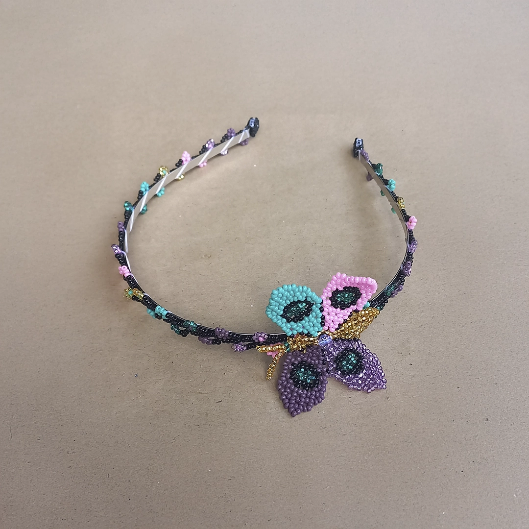 This exquisite beaded Butterfly Headband (Diadema Mariposa) is a delicate and vibrant hair accessory, meticulously handcrafted by skilled Guatemalan artisans using tiny, high-quality glass seed beads (mostacilla). The design features a slender metal band wrapped in dark beads and accented with small floral clusters, highlighted by a large, intricately woven three-dimensional butterfly that serves as a stunning focal point. Sold individually, these headbands come in a variety of brilliant color combinations, such as the featured version with wings in purple, turquoise, pink, and shimmering gold. This authentic piece of folk art beautifully blends functional fashion with the rich, colorful bead-weaving traditions of Guatemala, making it a unique and charming statement piece for any occasion.