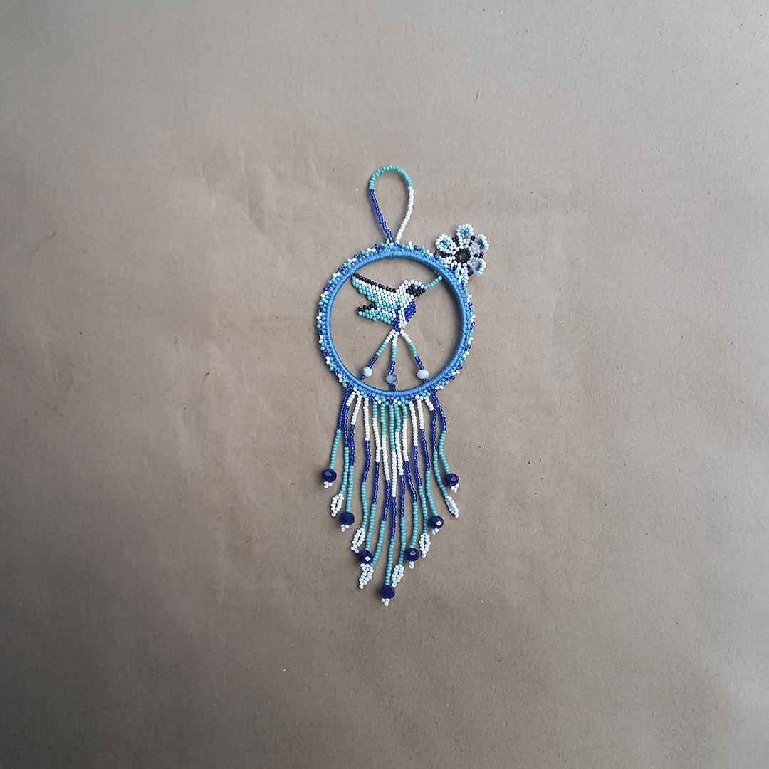 This vibrant hanging ornament is a handcrafted piece meticulously woven from small glass seed beads (mostacilla), showcasing a delicate hummingbird design suspended within a circular hoop. The ornament utilizes a cool and refreshing color palette dominated by shades of royal blue, turquoise, and white. The central hummingbird figure, detailed in turquoise and blue, is complemented by a small woven flower accessory attached to the side of the hoop. A decorative fringe of cascading bead strands in matching cool tones extends from the base of the hoop, accented with larger, faceted navy blue glass beads, resulting in a unique cultural accessory perfect for display or decoration.