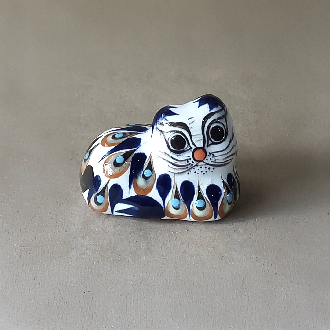 This charming ceramic Kitten figurine is a unique piece of miniature folk art, meticulously hand-painted and glazed by artisans from San Antonio Palopó, Guatemala, a community celebrated for its vibrant pottery tradition. The small, stylized, reclining cat features a predominantly white body adorned with rhythmic, high-contrast, feather-like patterns in black, deep blue, terracotta orange, and bright teal. It features large, expressive eyes and black whiskers, perfectly capturing the detailed and playful artistry characteristic of the Lake Atitlán region.