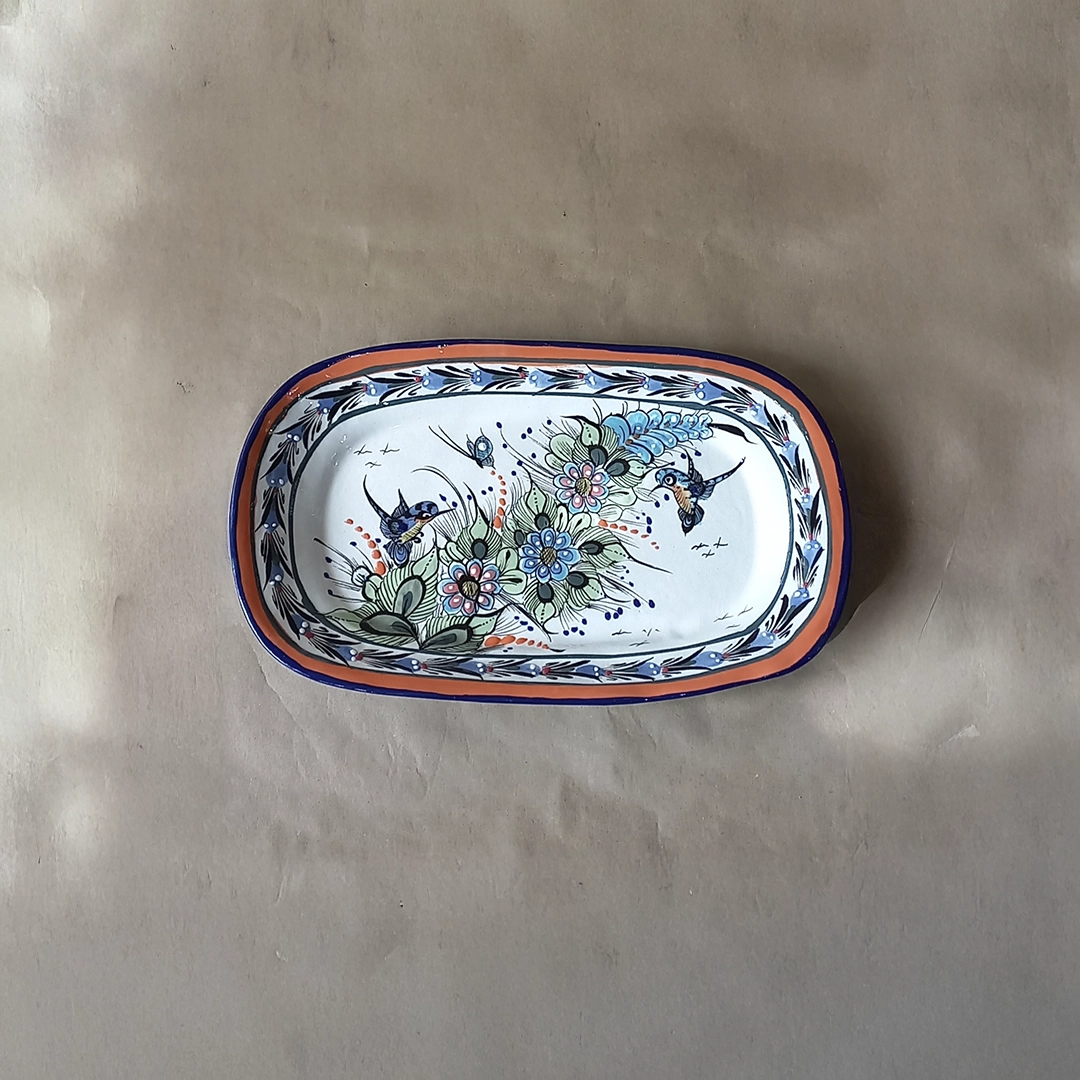 This beautiful ceramic Rectangular Plate (Plato Rectangular) is a substantial piece of functional folk art, meticulously hand-painted and glazed by artisans from San Antonio Palopó, Guatemala, a center celebrated for its vibrant pottery traditions. The large, rectangular platter features a glossy white center decorated with a lively, detailed scene of two hummingbirds and a butterfly feeding among large, stylized flowers and intricate foliage, all contained within a colorful border of blue floral motifs and a bold orange rim. This durable piece is perfect for serving appetizers or main dishes and beautifully showcases the cheerful, high-contrast, detailed artistry of the Lake Atitlán region.