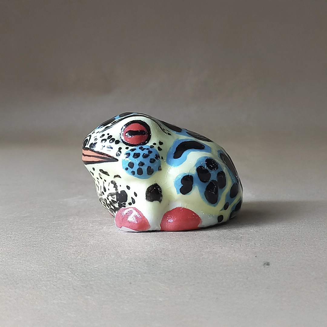 This charming ceramic frog figurine is a unique piece of miniature folk art, meticulously hand-painted and glazed by artisans from San Antonio Palopó, Guatemala, a community celebrated for its vibrant pottery tradition. The small, rounded frog is painted in a lively, speckled pattern, featuring a white base with black spots, vibrant blue blotches, and bold accents of contrasting color, such as striking red around the eyes and on the feet. This decorative piece captures the playful, high-contrast, and detailed artistry characteristic of the Lake Atitlán region.