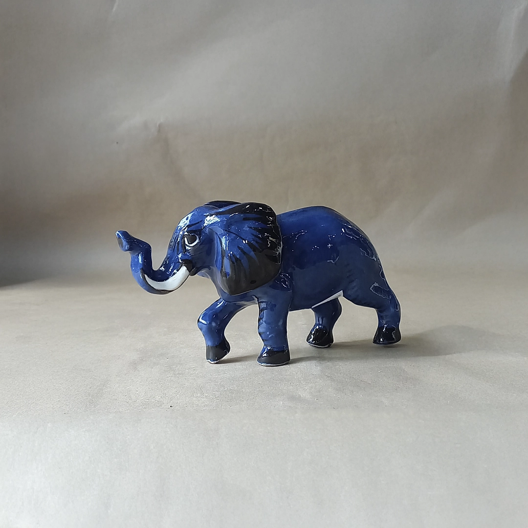 This striking ceramic Medium Elephant figurine is a unique piece of folk art, meticulously hand-painted and glazed by artisans from San Antonio Palopó, Guatemala, a community celebrated for its vibrant pottery tradition. The elephant is sculpted in a dynamic walking pose with its trunk raised for good luck. The body is finished in a high-gloss, deep cobalt blue glaze, contrasted by black accents on the ears and feet, and white tusks. This decorative figurine powerfully showcases the high-contrast color and smooth, stylized finish characteristic of the Lake Atitlán region’s artistry.