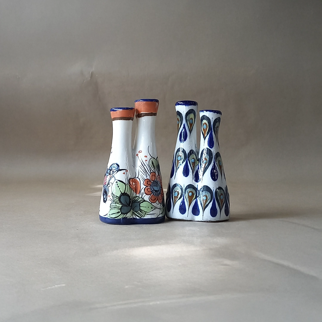 This attractive ceramic Mini Pampa Vases are unique pieces of decorative folk art, meticulously hand-painted and glazed by artisans from San Antonio Palopó, Guatemala, a center celebrated for its vibrant pottery traditions. Both vases share a distinctive hourglass or flared silhouette, divided into two tall, connected spouts. The vase on the left (the “bird” pattern) features a white body adorned with a colorful hummingbird and large, stylized flowers, with the spouts accented in terracotta orange. The vase on the right (the “plain” or liso pattern) is covered in the region’s characteristic dense, repeating pattern of blue, teal, and brown teardrop or “peacock feather” motifs. These charming, double-spouted pieces beautifully showcase the playful yet detailed artistry of the Lake Atitlán region.
