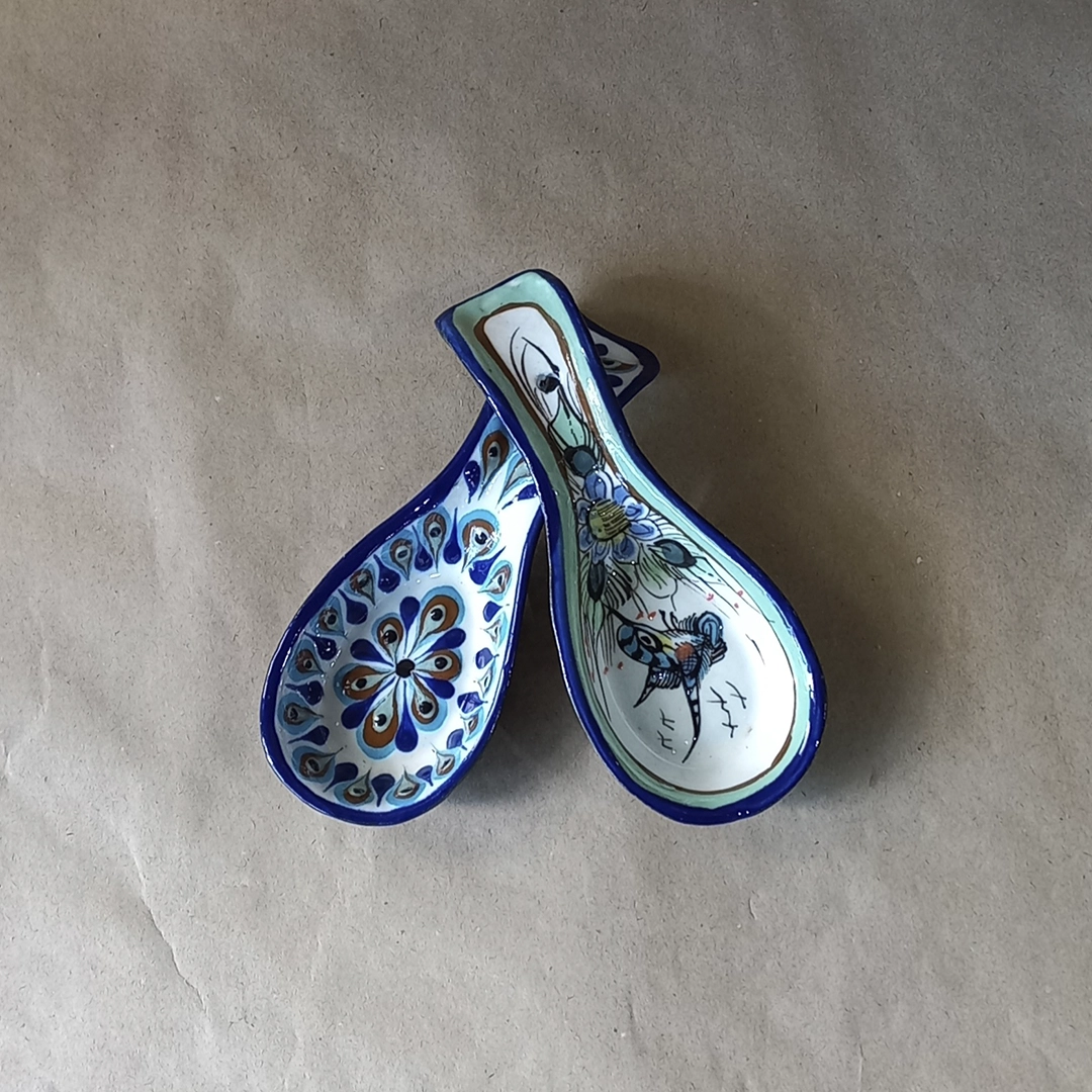 This charming ceramic Mini Spoon Rest is a practical and beautiful piece of functional folk art, meticulously hand-painted and glazed by skilled artisans from San Antonio Palopó, Guatemala. Designed with a classic contoured shape to neatly hold small utensils, this piece offers a choice between two signature artisanal styles: the “bird” design features a delicate hummingbird in flight among stylized blue flowers and lush green foliage on a white base, while the “plain” (liso) version is traditionally adorned with rhythmic, high-contrast teardrop motifs and a central floral sunburst in the region’s characteristic cobalt blue and terracotta palette. Finished with a bold blue rim and a glossy glaze, these durable spoon rests perfectly capture the detailed craftsmanship and vibrant aesthetic of the Lake Atitlán region, making them a delightful and authentic accent for any kitchen counter.