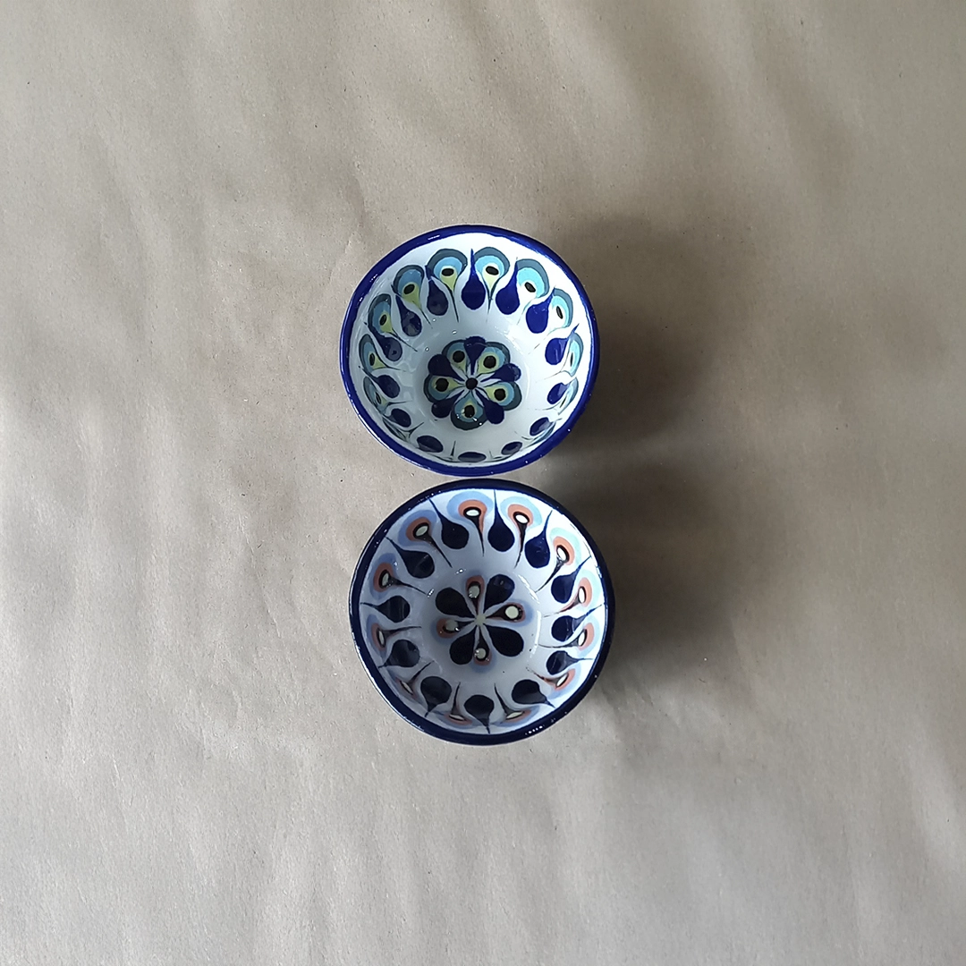 This appealing ceramic Plain Sauce Dishes (Salsero liso) are unique pieces of functional folk art, meticulously hand-painted and glazed by artisans from San Antonio Palopó, Guatemala, a community celebrated for its vibrant pottery traditions. Both small, rounded dishes feature a wide opening and are adorned on the interior with dense, rhythmic patterns of vertical teardrop motifs radiating outward from the center. One dish utilizes a palette dominated by blue, light aqua, and green accents, while the other features a warmer, more intricate design incorporating navy blue, brown, and soft pink highlights. These miniature serving bowls are perfect for holding sauces, dips, or tapas and beautifully showcase the detailed, high-contrast artistry characteristic of the Lake Atitlán region.